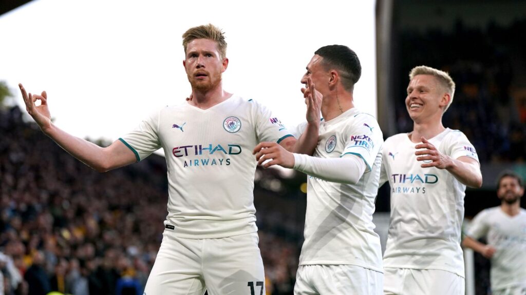 Kevin De Bruyne’s four-goal haul kept Manchester City on course for the Premier League title as the defending champions thrashed Wolves 5-1 at Molineux on Wednesday.