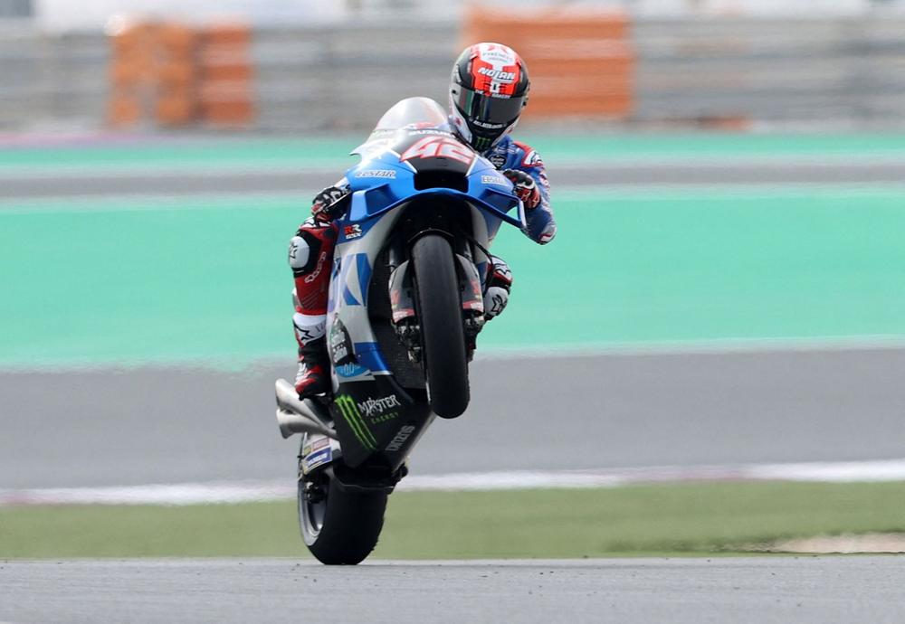 Alex Rins on one of the surprisingly quick Suzukis had the fastest practice time overall.